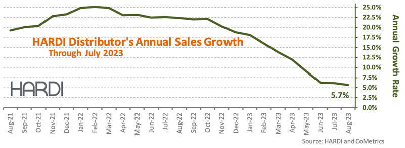 “HARDI distributor’s peak annual sales growth rate was just before the Fed began increasing rates during March of 2022,” said Loftus. “Distributor sales growth has been under pressure as the Fed increased rates eleven times during the past eighteen months. Hopefully the Fed is about done, along with the downward pressure on distributor sales growth.”